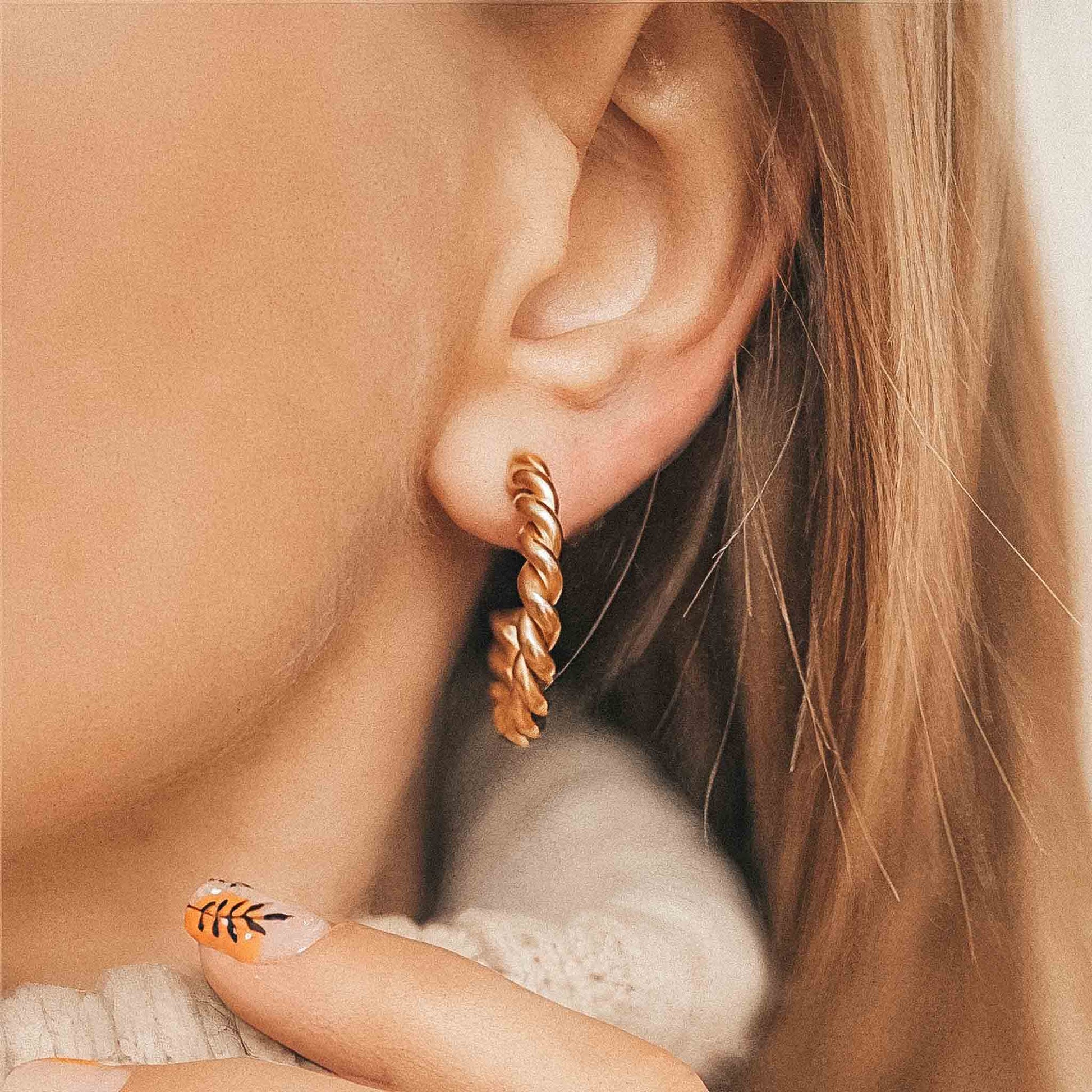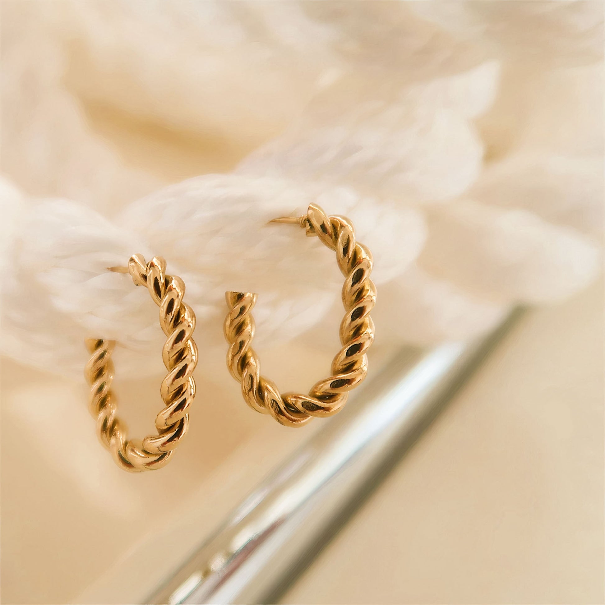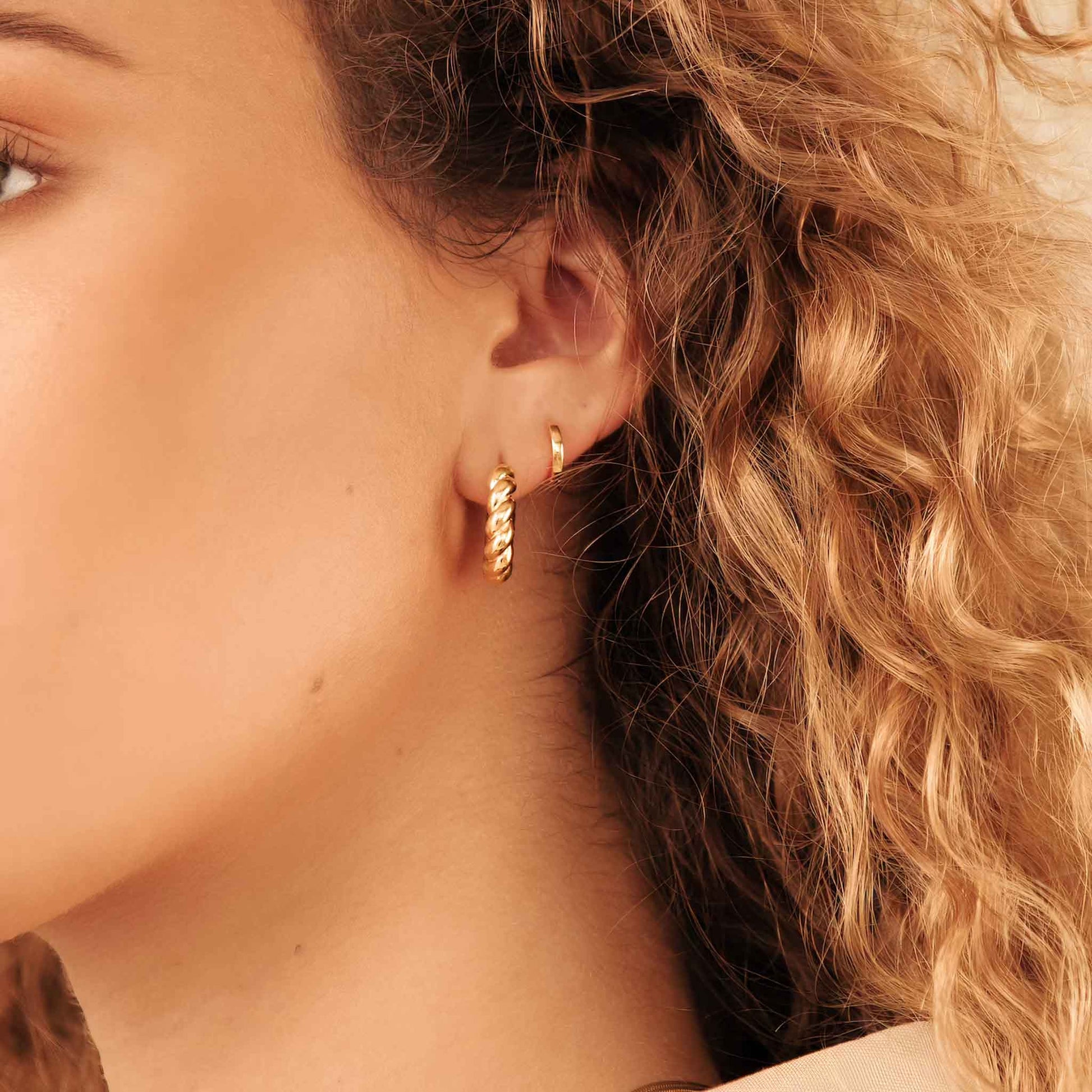 If you're looking for an elevated take on the traditional hoop earrings, then look no further than our Twisted Hoop Earrings. This design is super fashionable and trendy right now. Stack it with other earrings or match it with our twisted style ring for a cohesive styling treatment! The main picture represents 25mm size hoops.