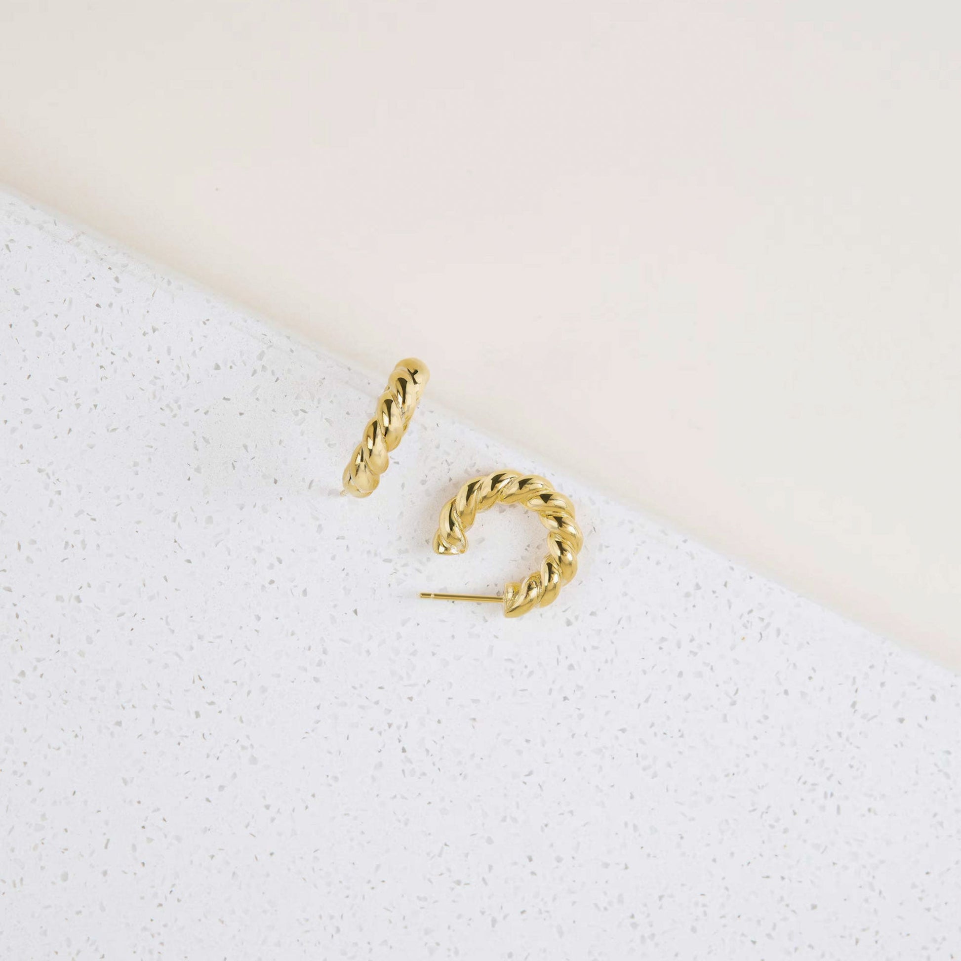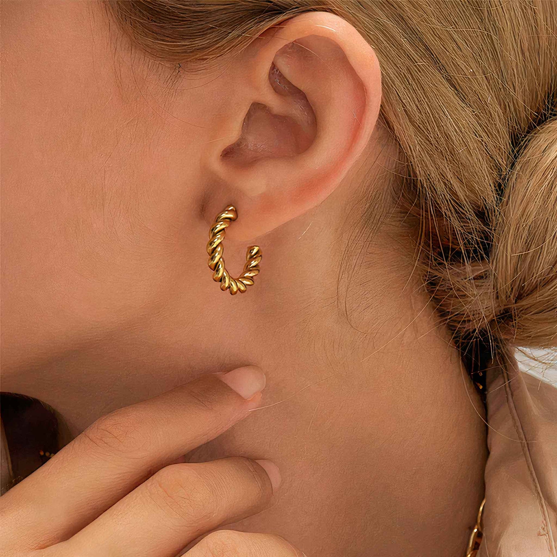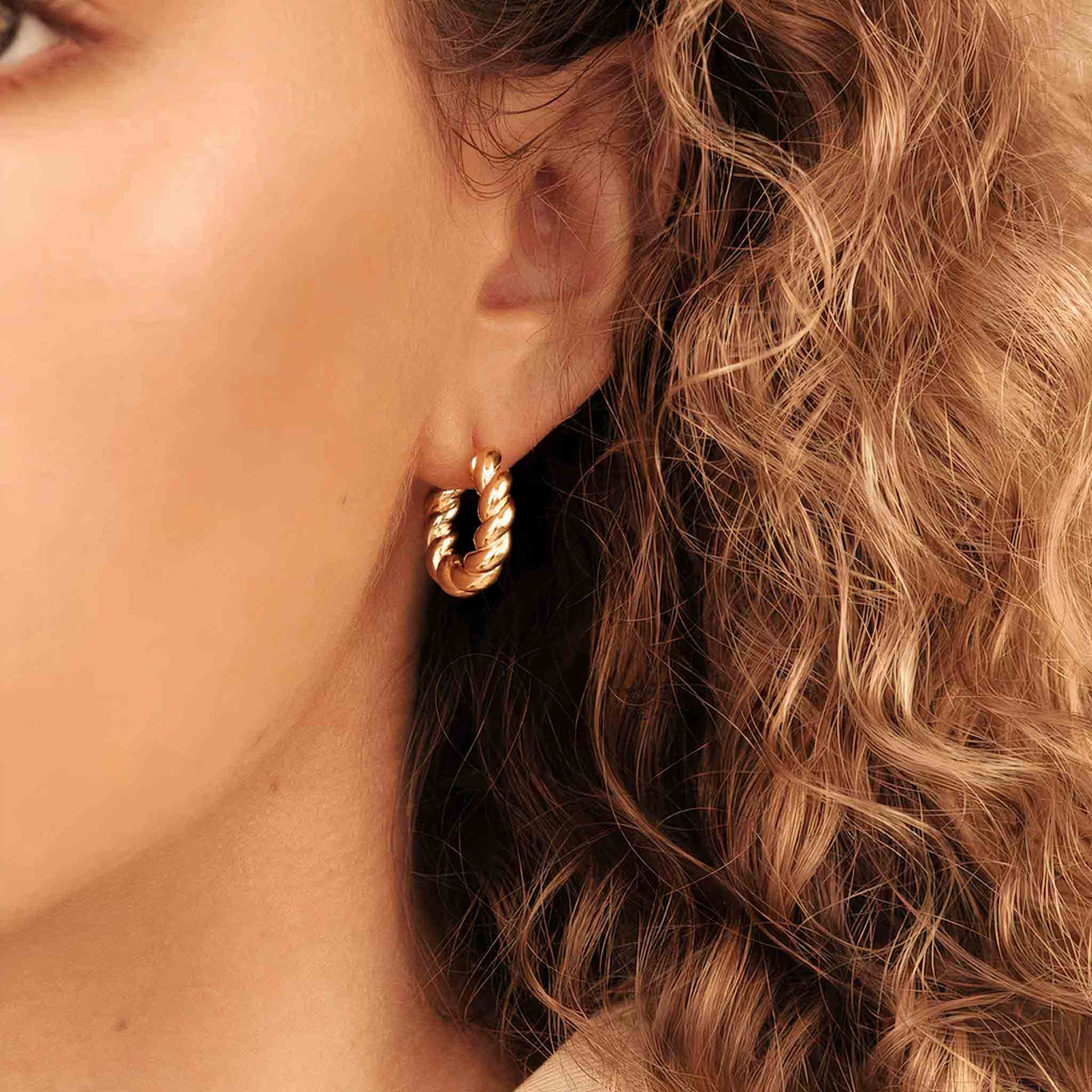 If you're looking for an elevated take on the traditional hoop earrings, then look no further than our Twisted Hoop Earrings. This design is super fashionable and trendy right now. Stack it with other earrings or match it with our twisted style ring for a cohesive styling treatment! The main picture represents 25mm size hoops.