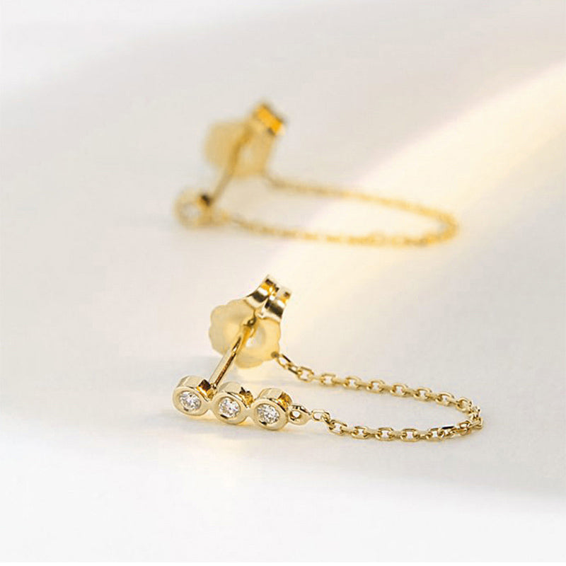 18K Gold or Silver finish Our 3 prongs small diamond earrings connected by a dainty chain perfect for everyday or special occasion. Sold as a pair.