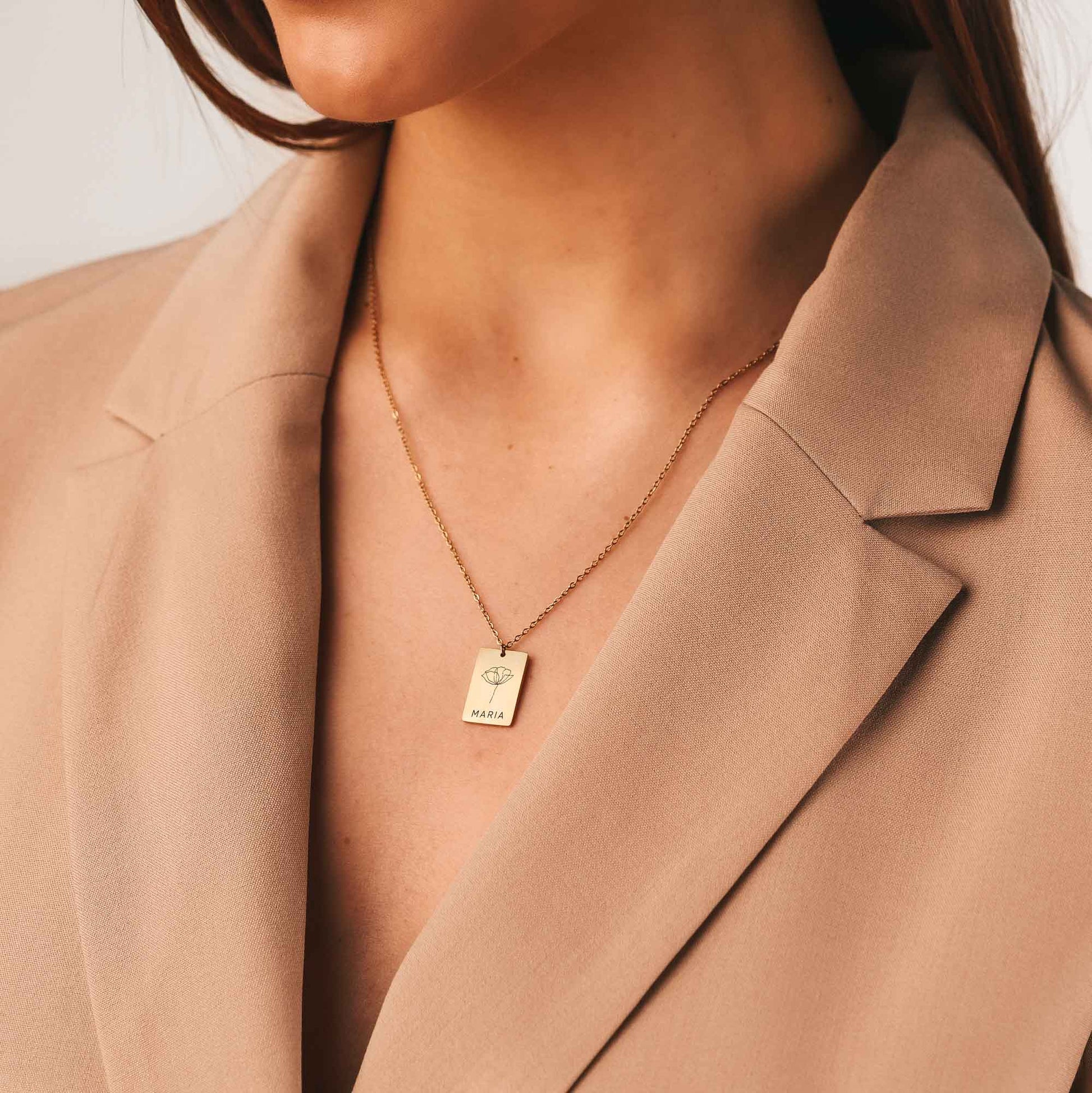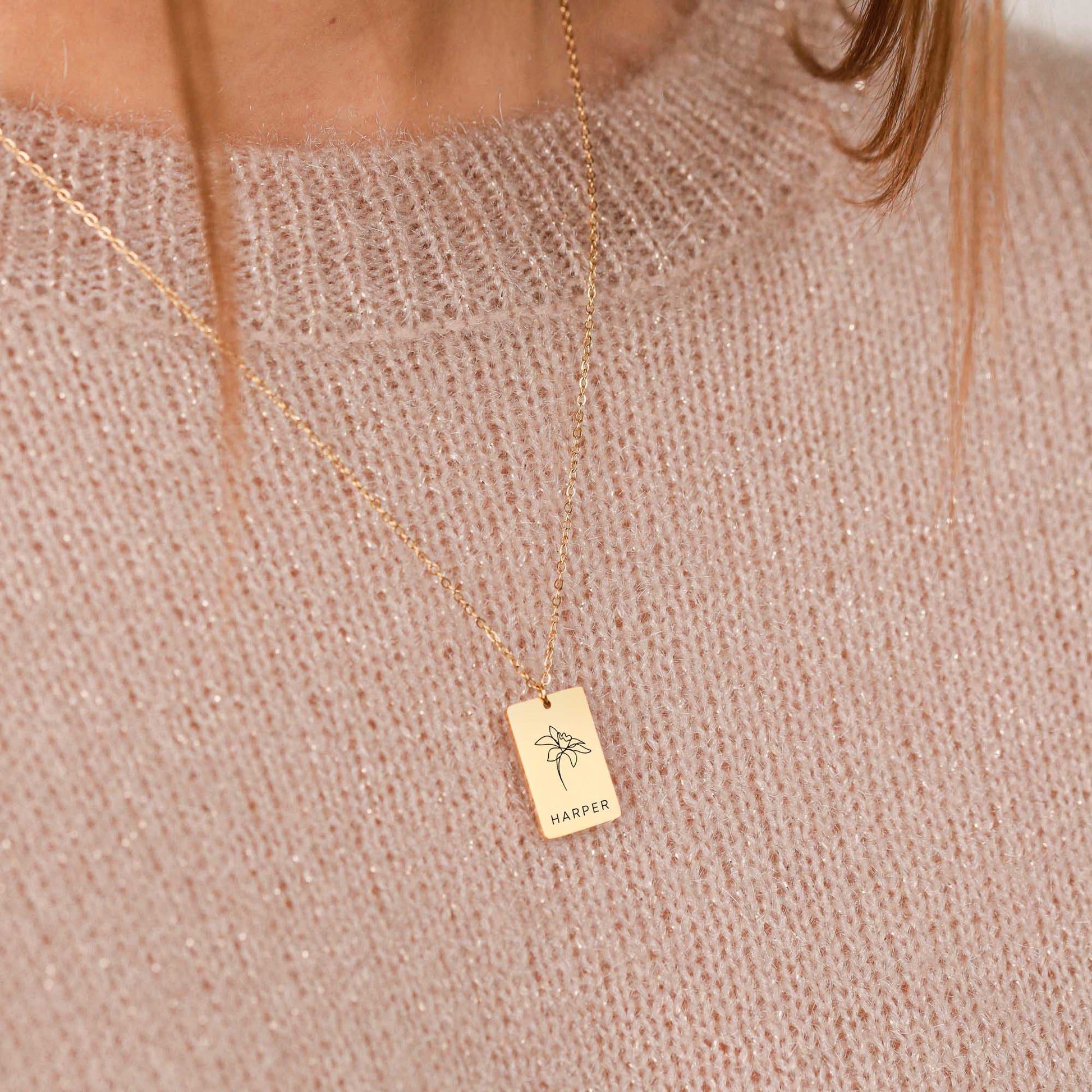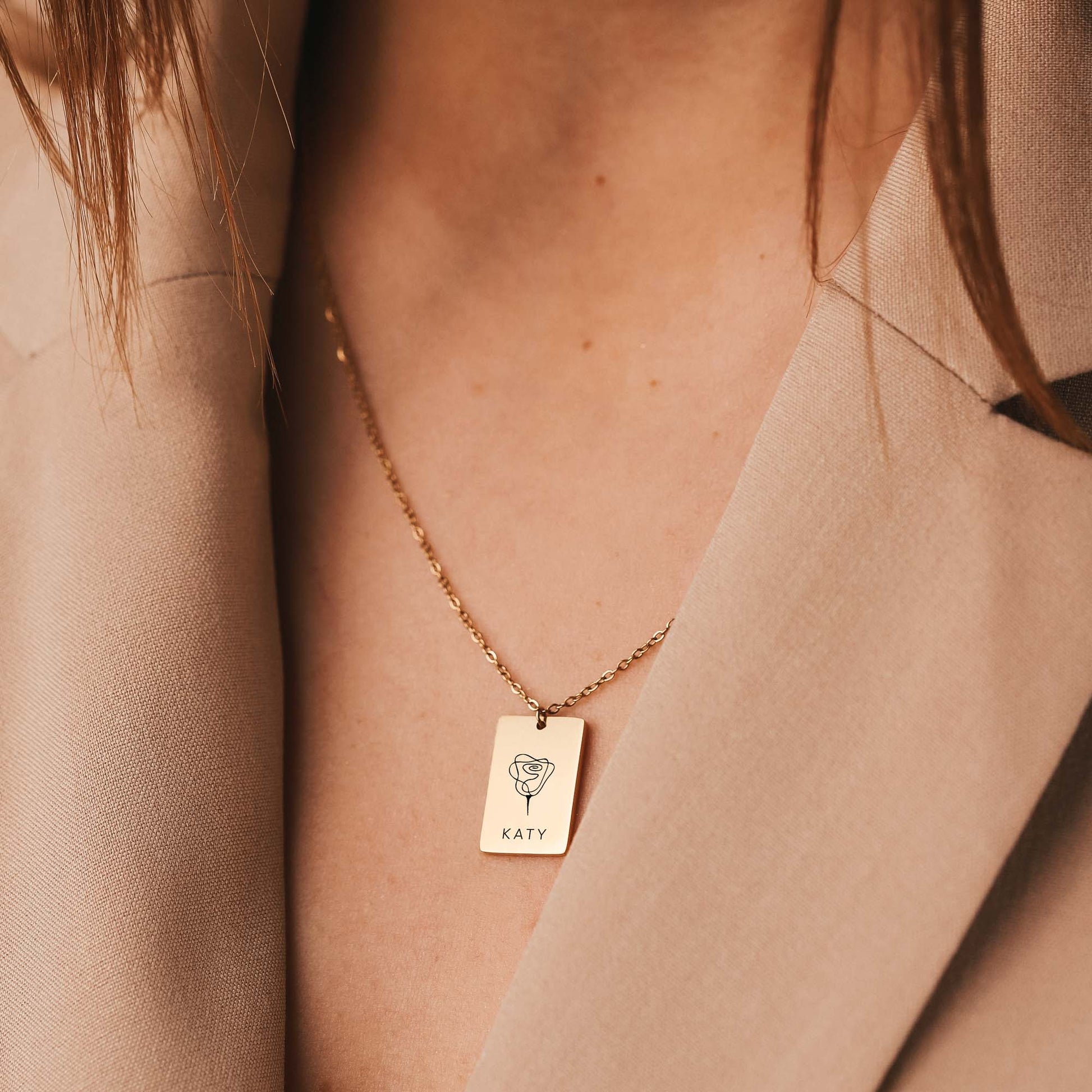 Harmony and thoughtfulness that goes into our birth flower necklace with a name! This charming rectangle piece is intricately crafted, with an engraved birth flower and your name or word. The overall look is beautifully balanced, making it a favorite with those who prefer versatile, contemporary jewelry.