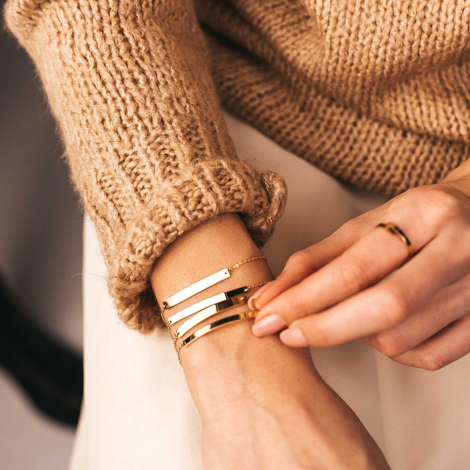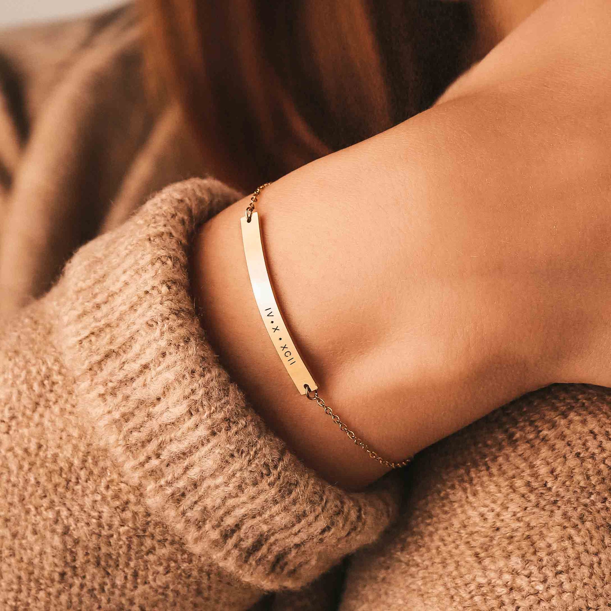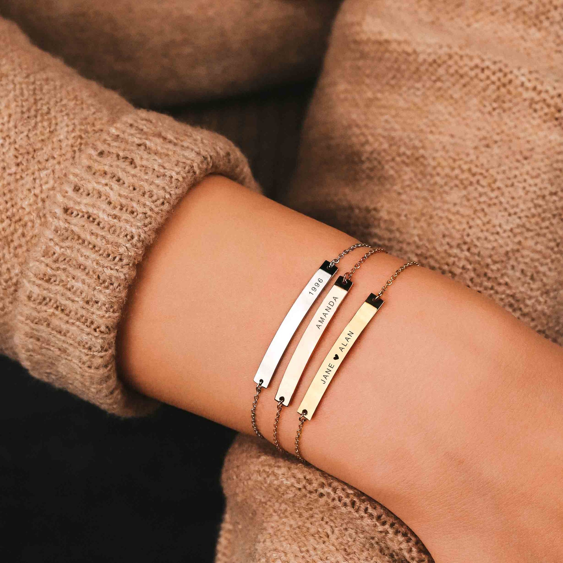 Our Personalized Bar Bracelet with custom phrase offers the soft, dainty and beautiful gleam with one of the most popular jewelry styles today’s designers have to offer. The look begins with a horizontal bar pendant which you can choose from 3 types. Looks good alone or stacked.