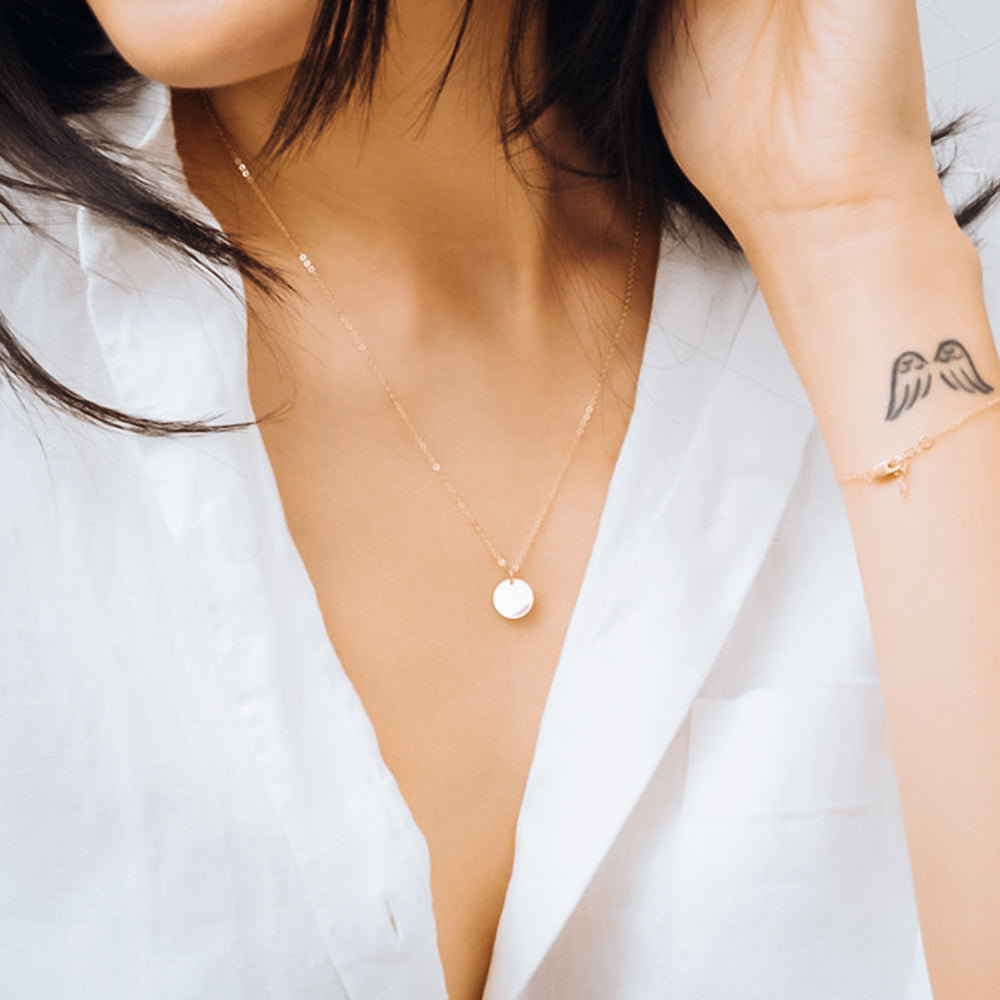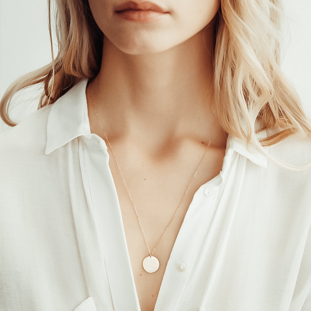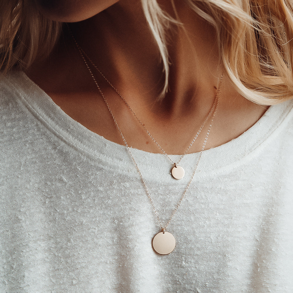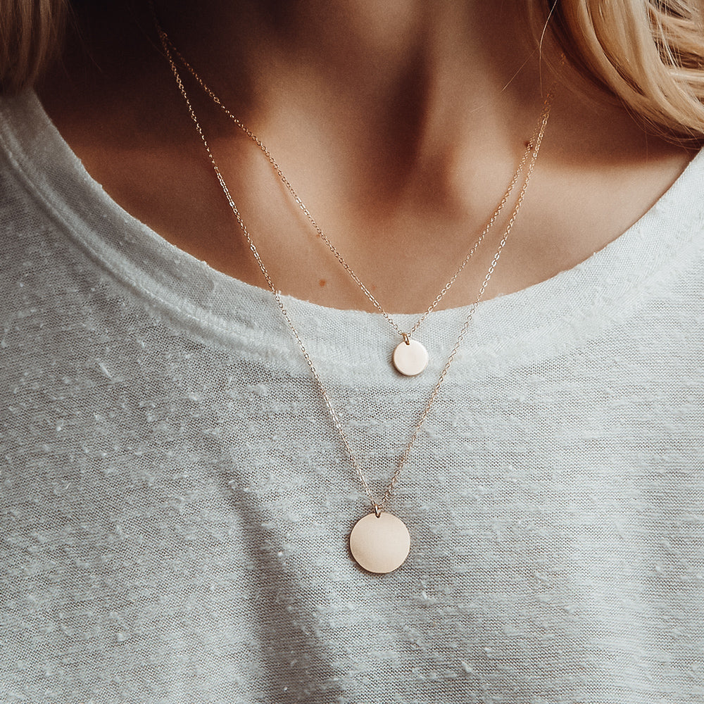 Jump on the layered necklaces bandwagon! We are obsessed with this two-coins layered necklace set of 2. This double chainset features a single hole tiny disc necklace and our bigger 15mm disc necklace! Both discs can be engraved with initials in artistic or classic font or symbols of your choice! Personalization guide click