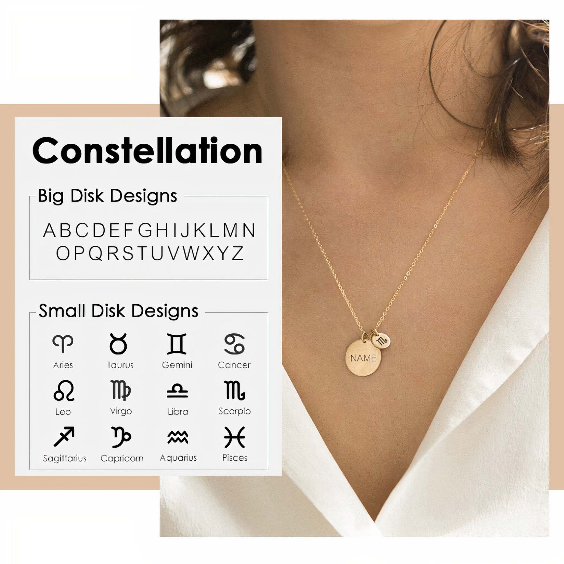 Our designers wanted to offer something unique: Our Name Necklace in duo with Constellation Pendant is the result! This piece manages to offer a sense of lighthearted whimsy while doubling as a pretty accessory that can be worn any time alone or stacked. Minimalist design makes this piece trendy & fashionable.