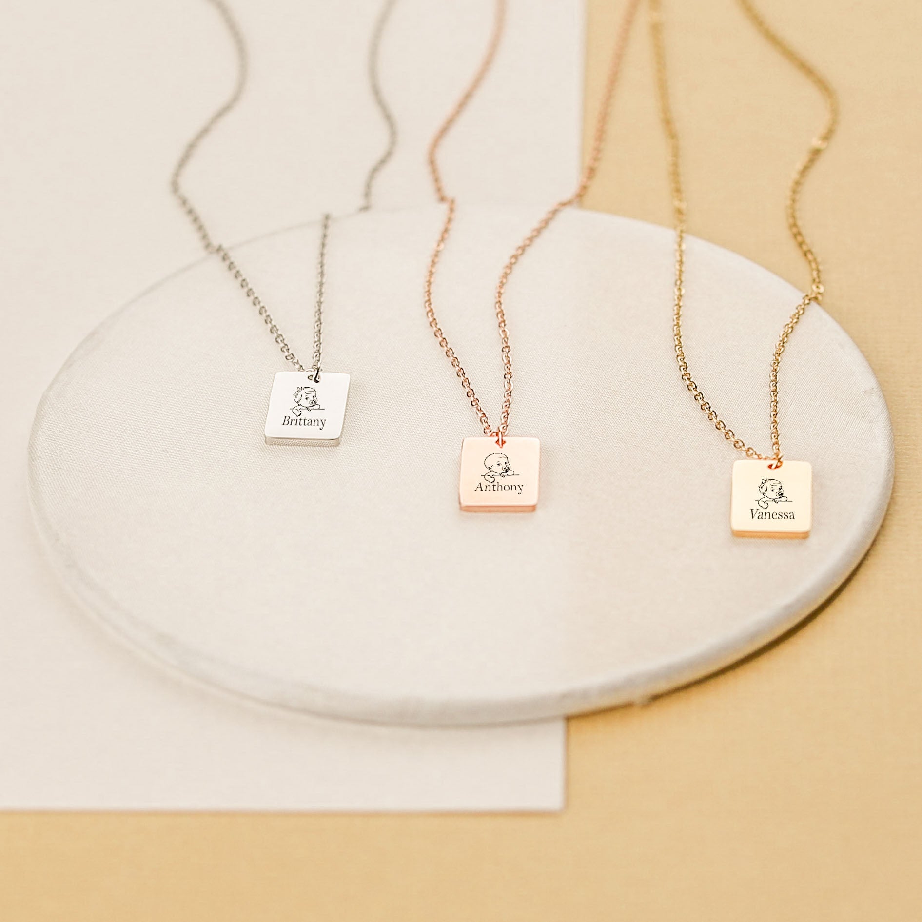 Cute and adorable! My baby engraved name necklace is our most wanted piece in Mother's jewelry collection. A single boy or girl pattern with the name of your loved one into one loveable design. One-of-a-kind perfect jewelry gift.