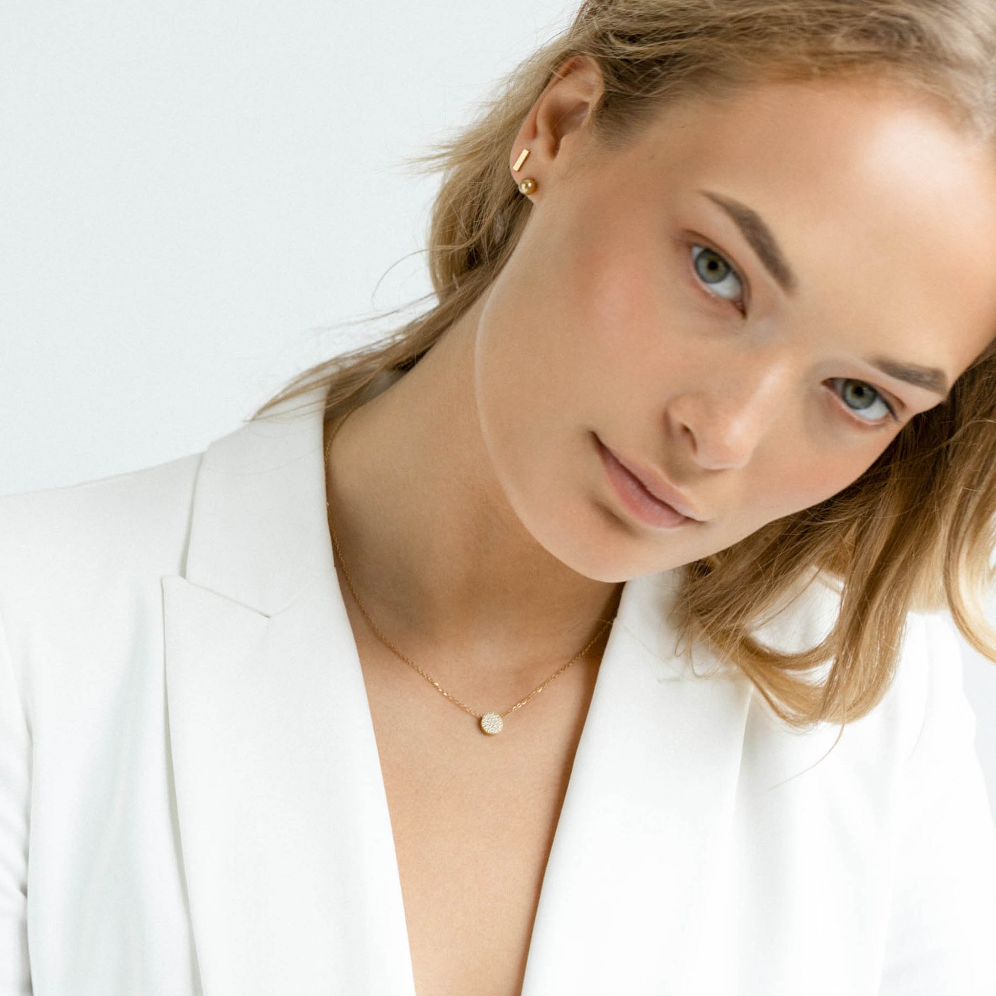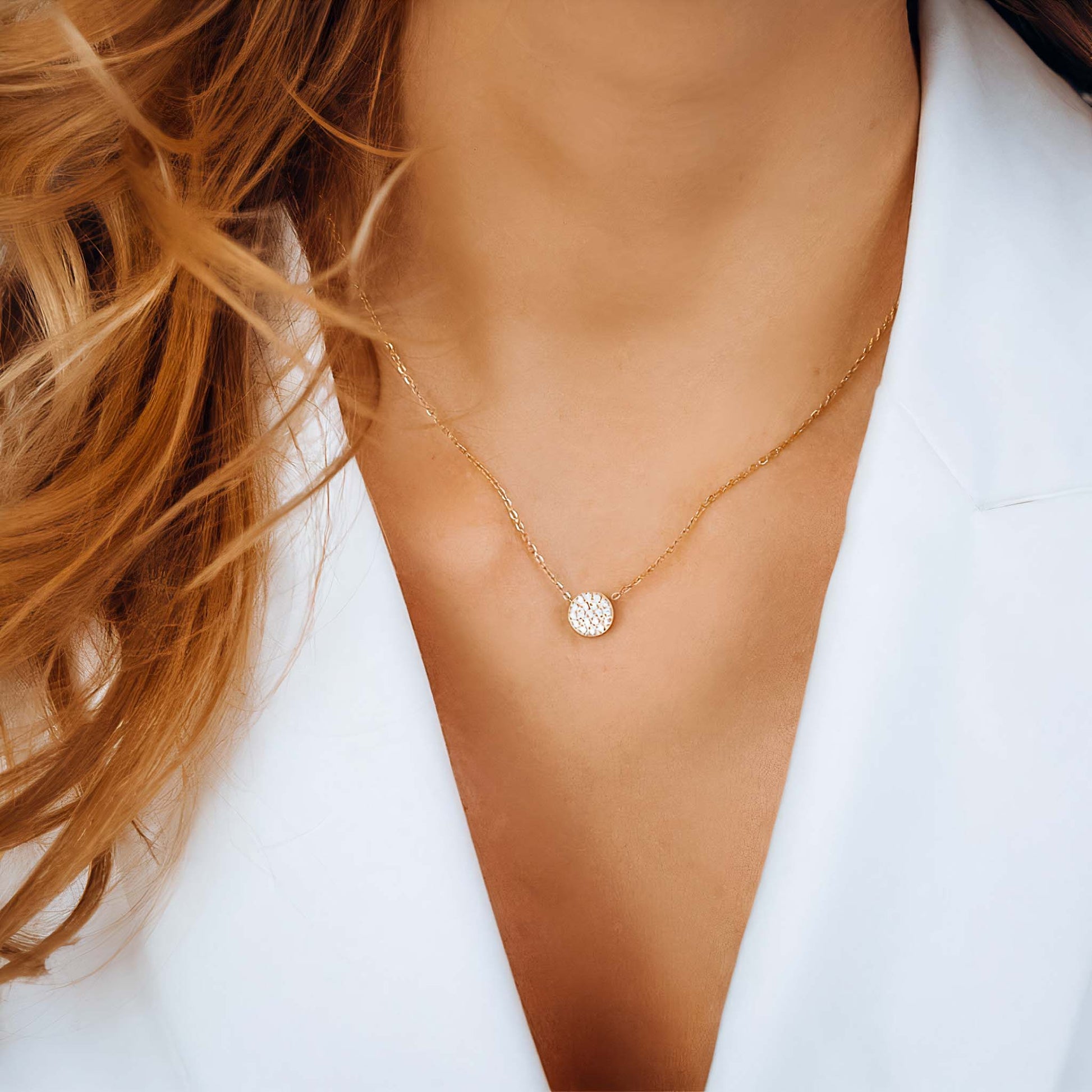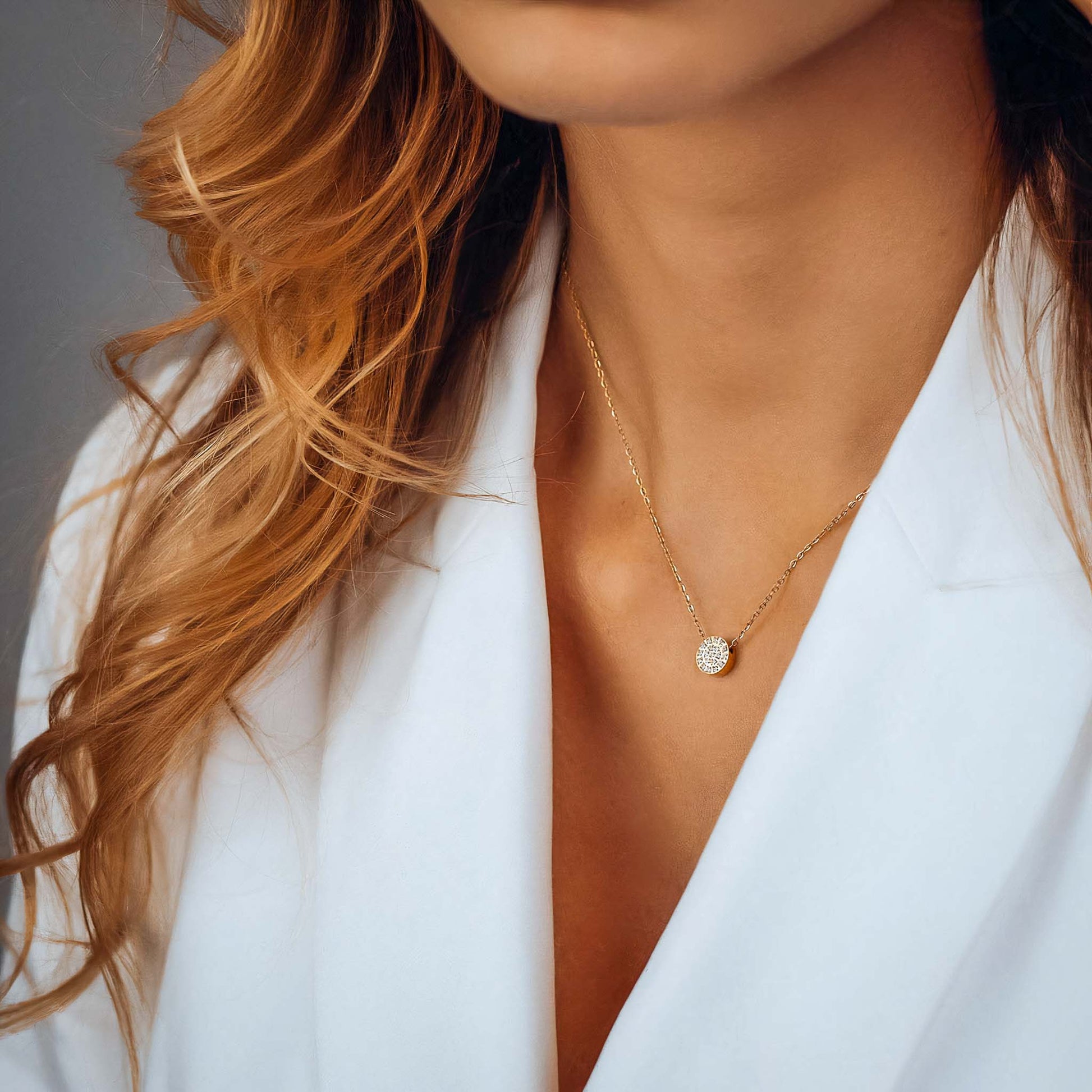 Our Sparkling Diamonds Pendant Necklace offers a special finish that’s designed to catch the light from every angle. Chic and modern is the perfect gift for many occasions. This necklace has set on the circle charm 19 CZ diamonds with a micro pave stone setting technique. Great for everyday wear, wear solo or layer with other necklaces.