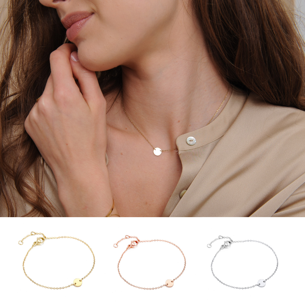 Simple elements come together in our tiny initial coin necklace and bracelet set, creating an unexpected minimalist masterpiece.