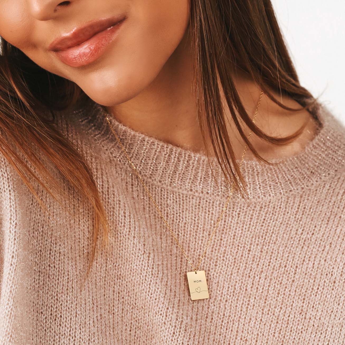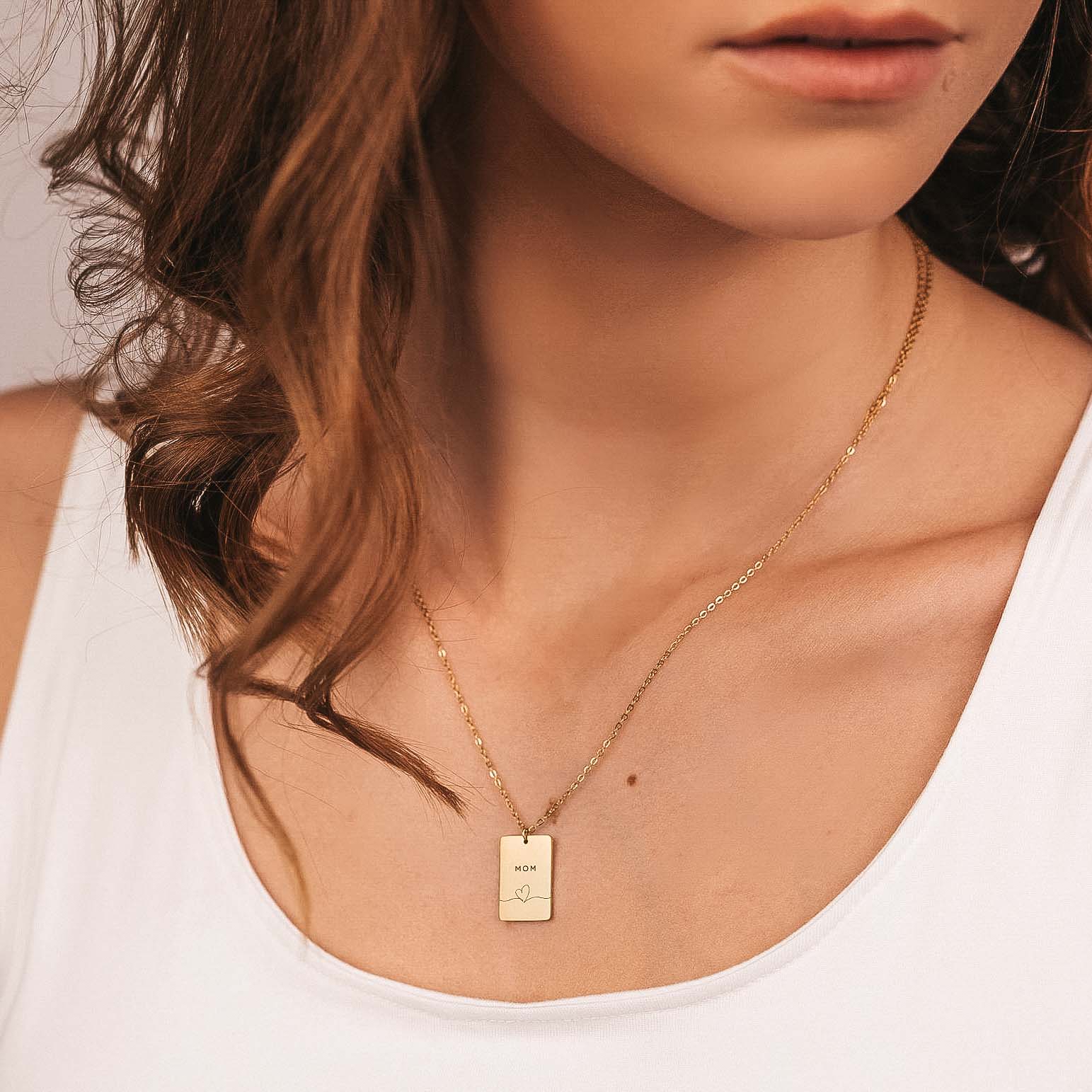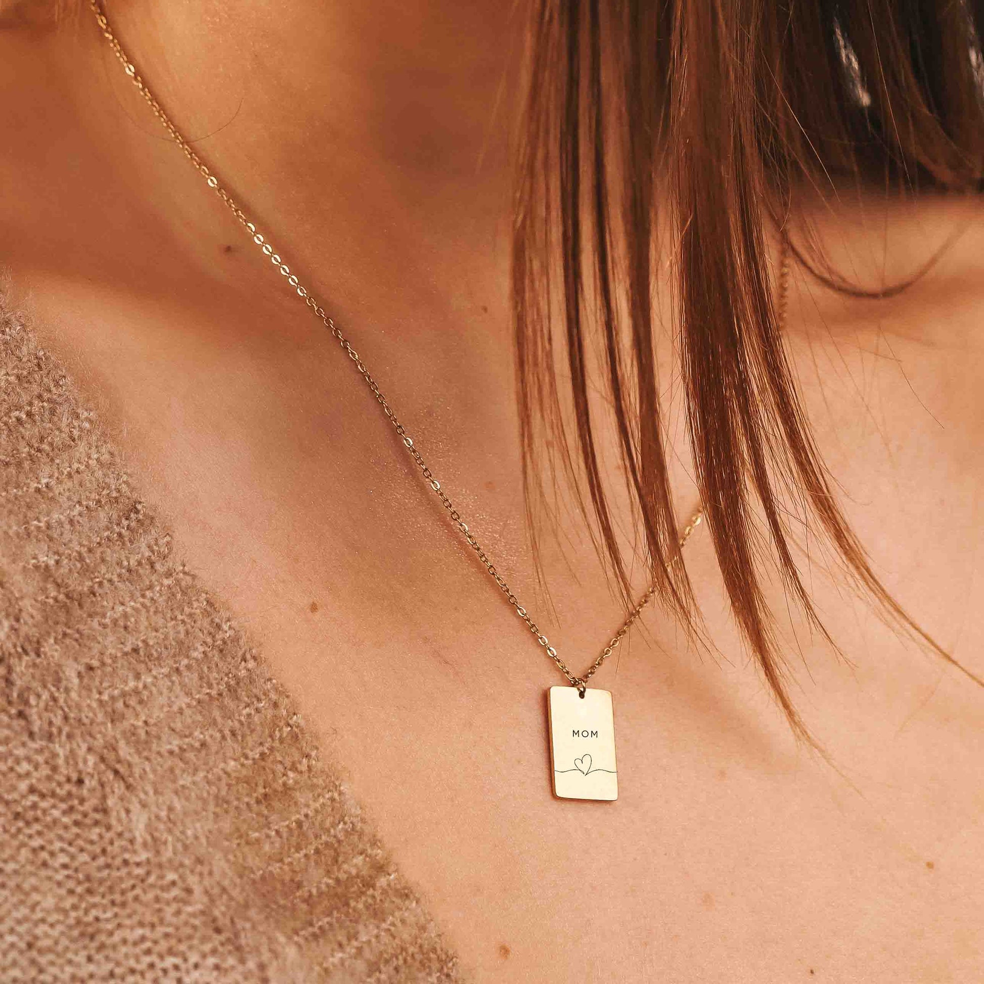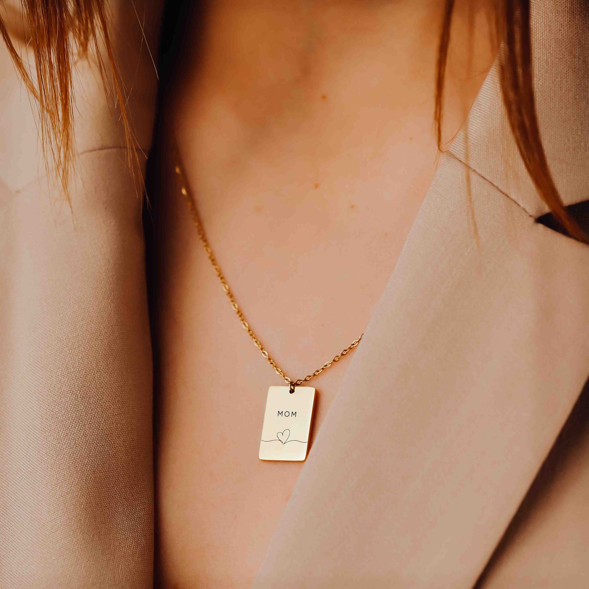 Elegant, simple, and classy never goes out of style! Treat mother to something exceptional: Trendy rectangle necklace for mom. This necklace features a unique hand-drawn heart pattern with mom word on the top.