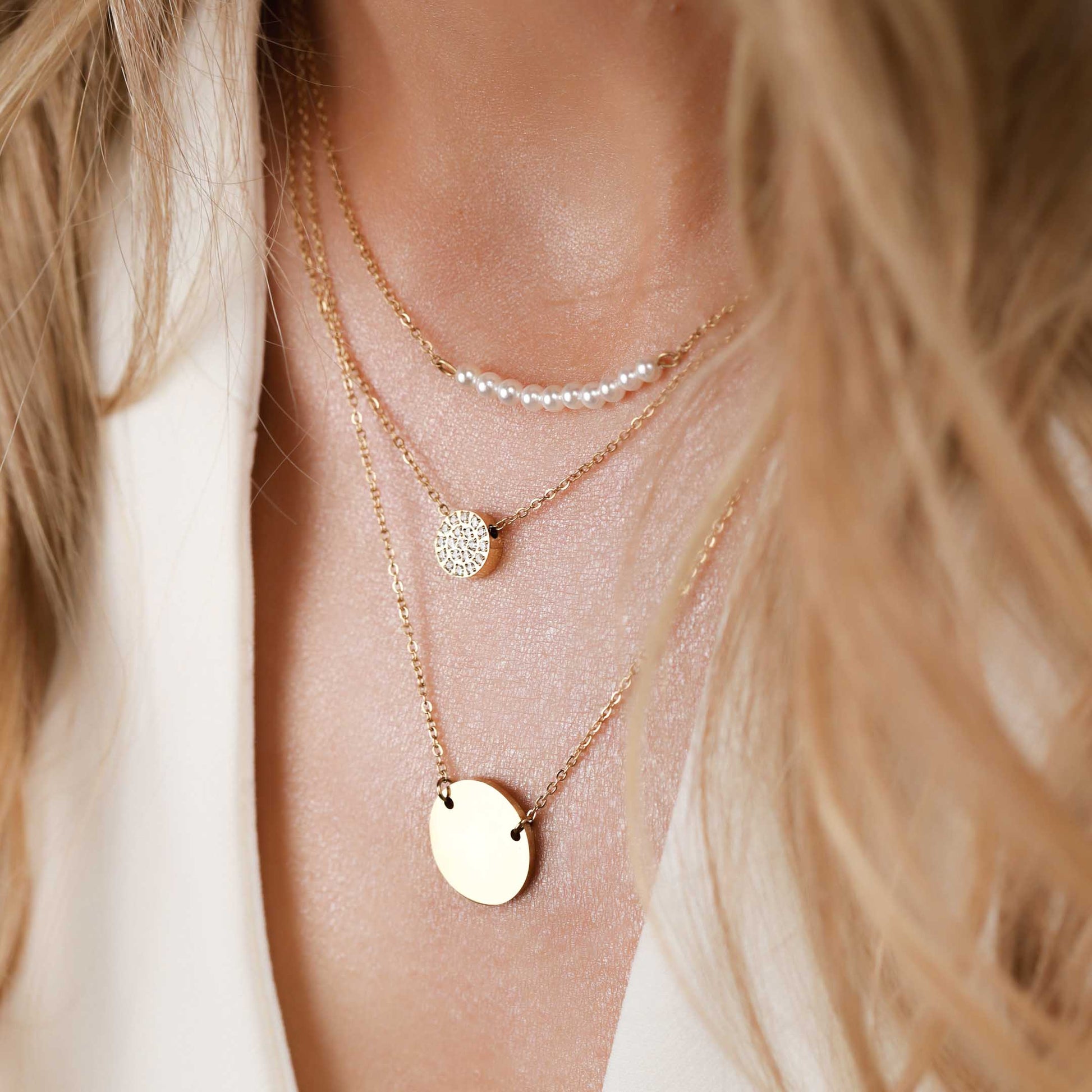 Layered necklaces are extremely on trend right now within all fashion circles and we created our collection of already layered accessories for you. When it comes to layering necklaces you can choose to wear them alone or stacked! This triple chain set includes a beaded pearl choker, middle sparkling unique pendant and bottom disc with a engraving option!